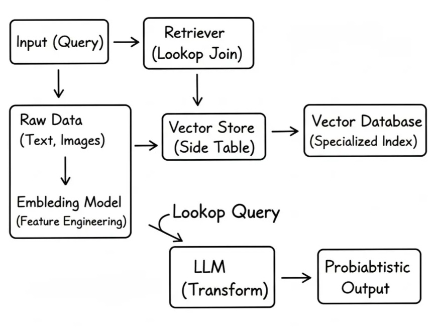 Structurally, RAG is enrichment. You take an input record, look up related context from a side store, and attach that context before the final transform runs. The only unusual part is the lookup key. Instead of equality, you search by similarity.
