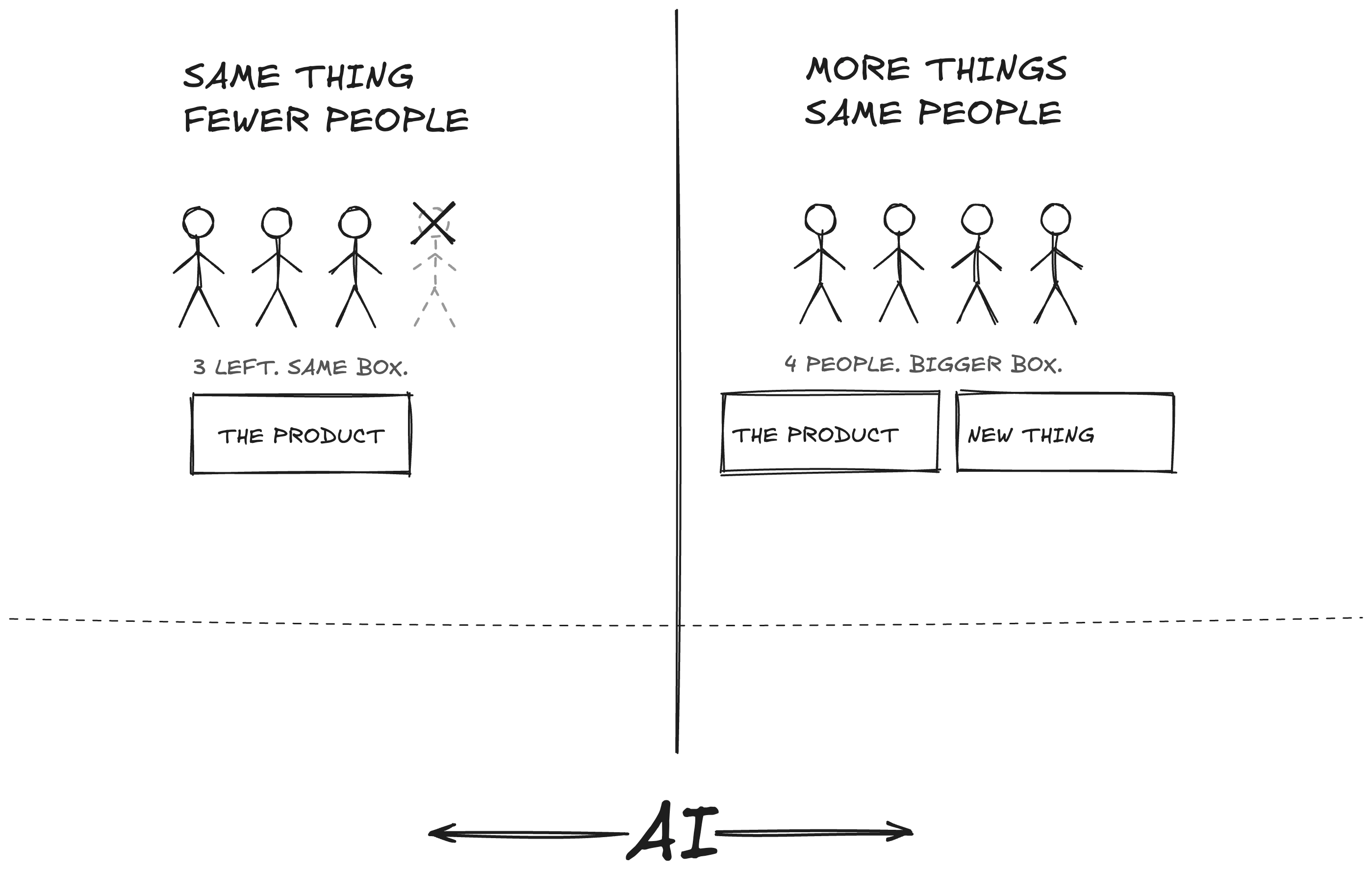 When that thesis is missing, every new tool becomes a cost lever. AI shows up and the question leadership asks is “how many people can we remove from the org?“