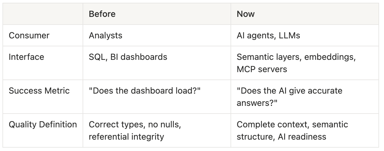 Before Now Consumer Analysts AI agents, LLMs Interface SQL, BI dashboards Semantic layers, embeddings, MCP servers Success Metric “Does the dashboard load?” “Does the AI give accurate answers?” Quality Definition Correct types, no nulls, referential integrity Complete context, semantic structure, AI readiness