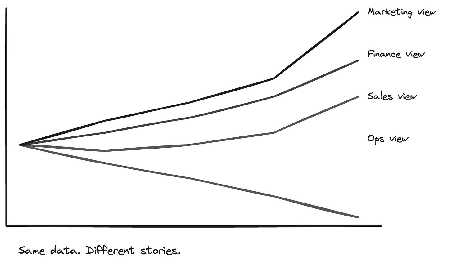 Insight multiplies interpretations. The same dataset produces different stories depending on who is looking, what they own, and what they are incentivized to protect.