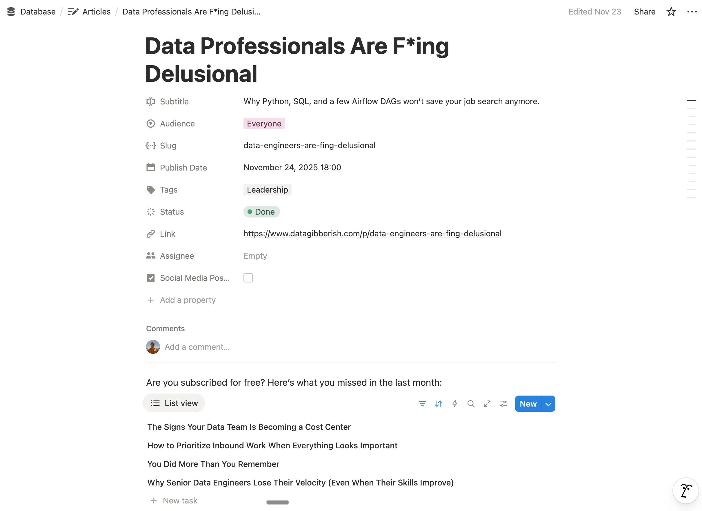 This is where planning lives. Calendars, product arcs, and high-level structure sit here. It’s the place where ideas turn into commitments. I use Notion for everything outside of writing too, and still haven’t paid a dime.